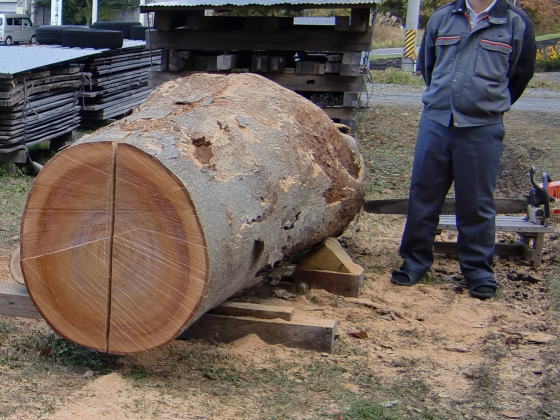原木といってもいろいろとありますが、太さが同じ樹齢50年の物と、樹齢200年の物とでは、材質が全く違い、太いからといって価値が高い訳ではありません。質の良い物を探すために、原木をみて探すには木の生い立ちを思い浮かべ想像をし本人が製材、乾燥を行い板の暴れ、割れを確認し乾燥後、加工を行います。その質を確認出来るようになるには、かなりの経験を必要とします。